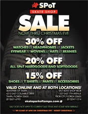 Now through Christmas Eve, all regular priced items are on sale. Newest Nike SB stuff and jackets are excluded. For shoes click your size here to see what's on sale. For apparel, click your size here to see what's on sale. Watches are 30% off and all regular priced SPoT stuff is 20% off. Full details are here: