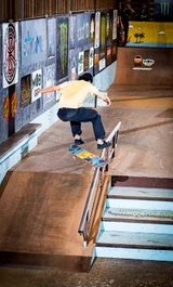 Justin Sommer shows off to the Face Tat chick with a Fakie Flip Down the Four.