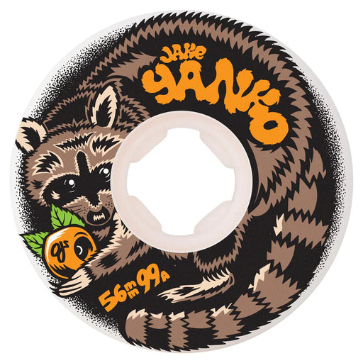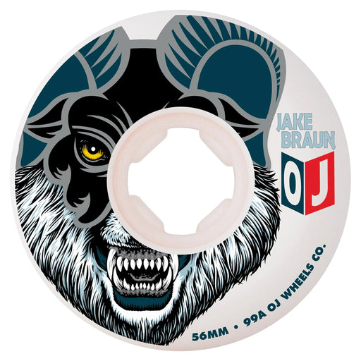 56mmOJ Wheels 56mm, 99a Jake Braun Wolf Elite Hardline white featuring Jake's Icelandic Sheep Wolf Strangelove graphics and custom packaging.