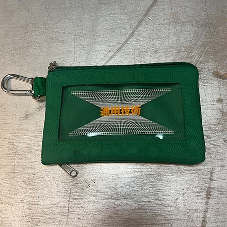 Nylon zipper closure pouch. Clear vinyl window. Printed logos. Carabiner