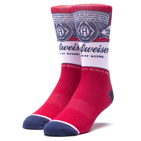 It's bottoms up with the HUF x Budweiser Buds For You Crew Socks. Featuring a collabeerative 'Hufweiser' label ankle-wrap graphic, and footbed verb...