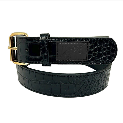 • Faux croc skin leather with sewn on patch• Gold Buckle• Fits 32-40” waist (with room for extra holes)
