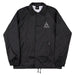 The Huf Triple Triangle Coach Jacket features a custom logo print design at the left chest side with a button snap up front closure, has a built-in draw cord at the bottom hem with a standard collar and a large screen print at the backside with a regular fit.