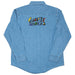 Quartersnacks Pop Art Denim Long Sleeve Button Up Shirt. Front Pocket, button down closure. No branding on front, big embroidered branding on back.