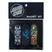 The Santa Cruz Deck Series 1 custom shaped magnet set features artwork from Winkowski Primeval, Screaming Hand, and Winkowski Dope Planet artwork.