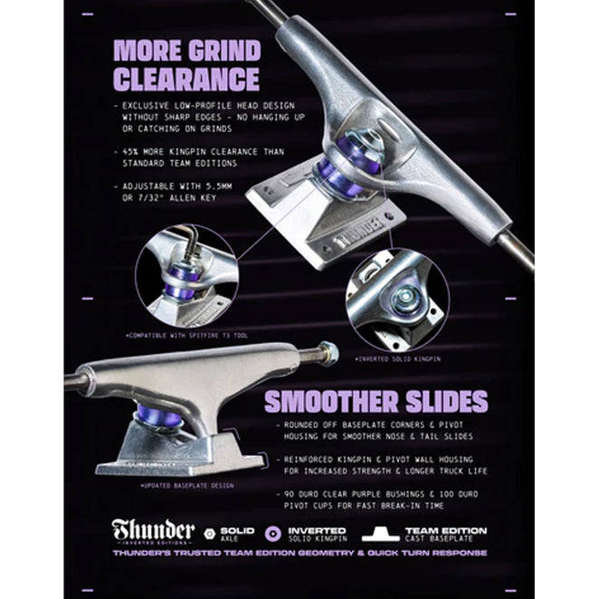 Thunder’s new Inverted Editions are back in stock in 148 & 149. With 45% more kingpin clearance than standard Team Editions and an updated baseplate design for smoother nose and tail slides, these are everything your local Thunder fan has been waiting for, load up.